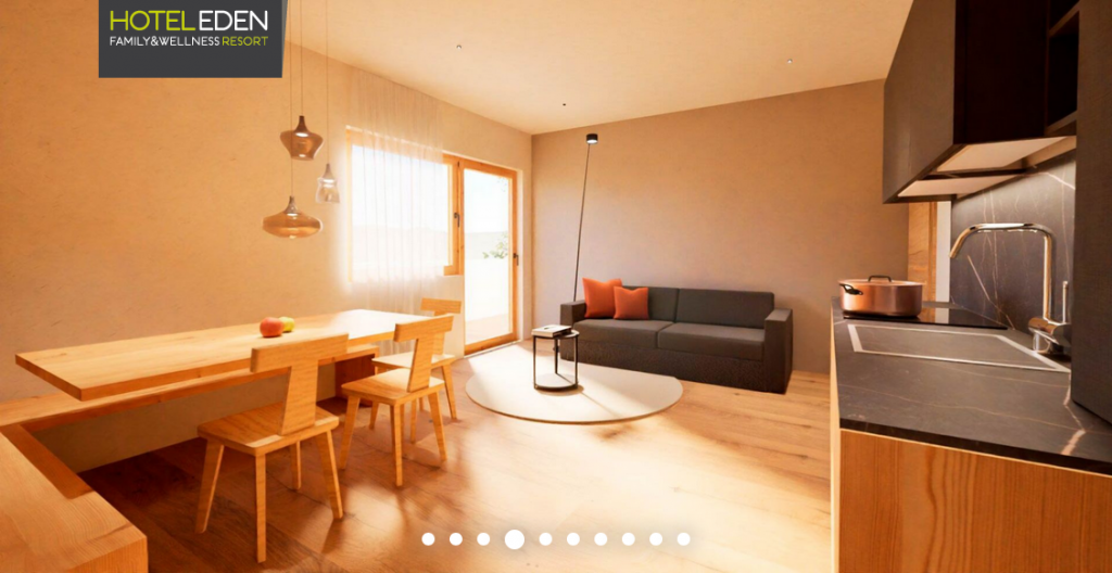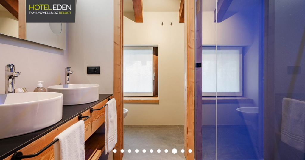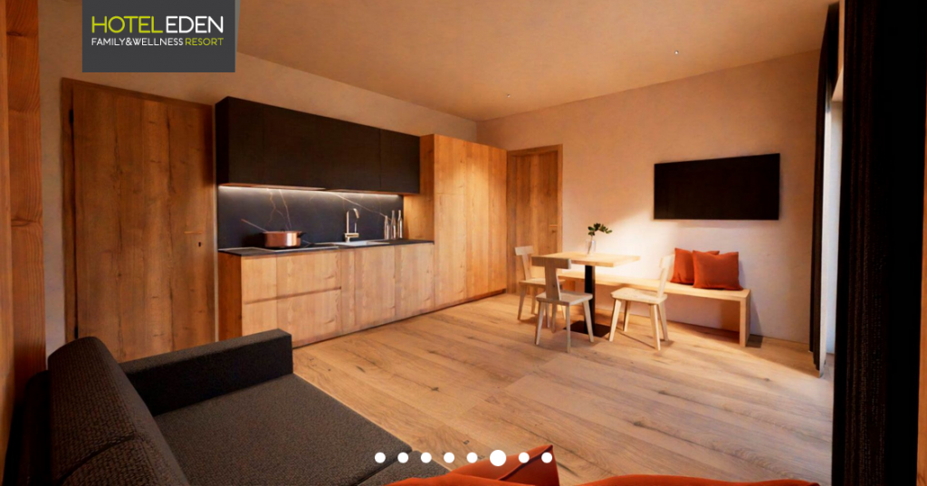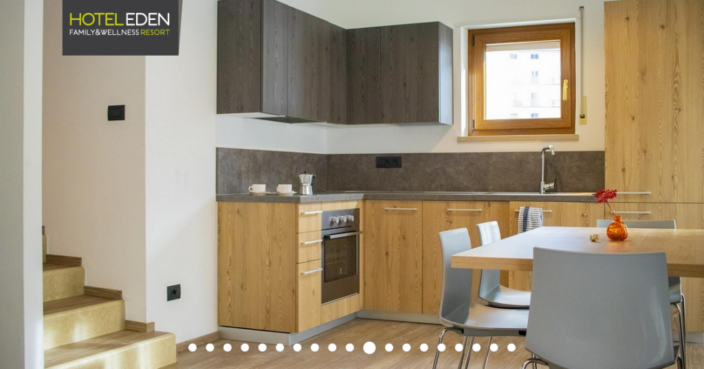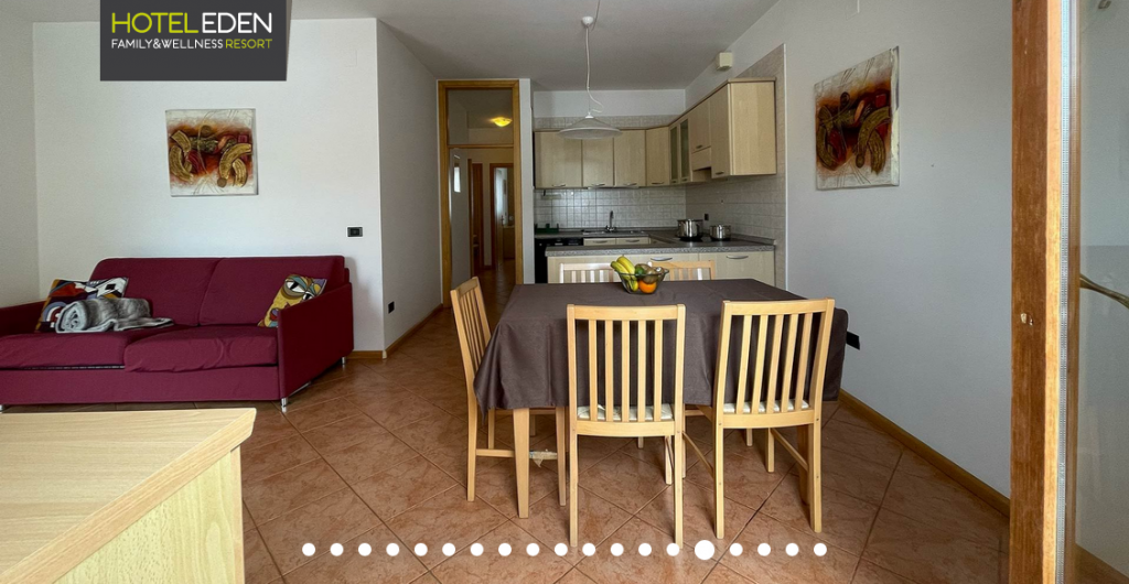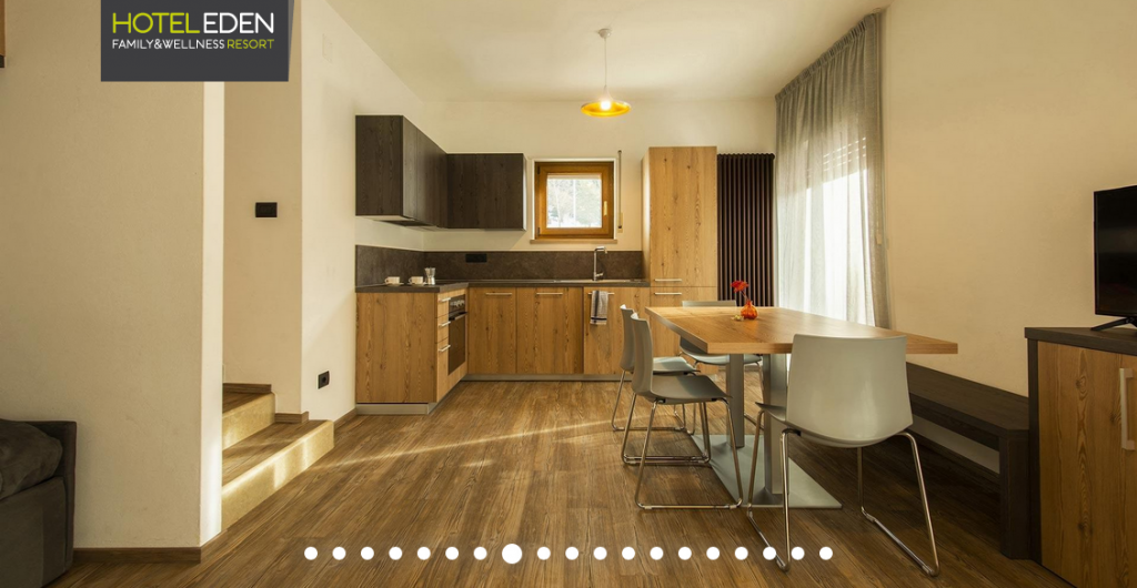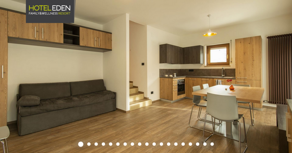Nowy apartament z dwoma oddzielnymi pokojami i dużą łazienką z prysznicem, urządzony w nowoczesnym alpejskim stylu, z drewnianą podłogą i parkietem. Pokój dwuosobowy z przeszklonym salonem i balkonem z zapierającym dech w piersiach widokiem na Dolomity Brenta. Pokój dzienny z trzecim i czwartym łóżkiem. Wyposażenie obejmuje telefon, 2 telewizory i sejf. Dla Gości przygotowano również szlafroki i kapcie do spa Eden.
