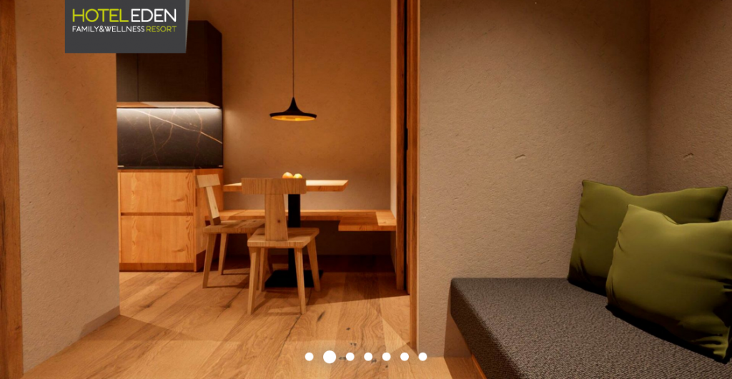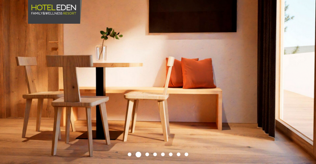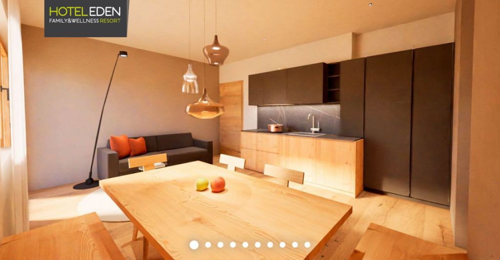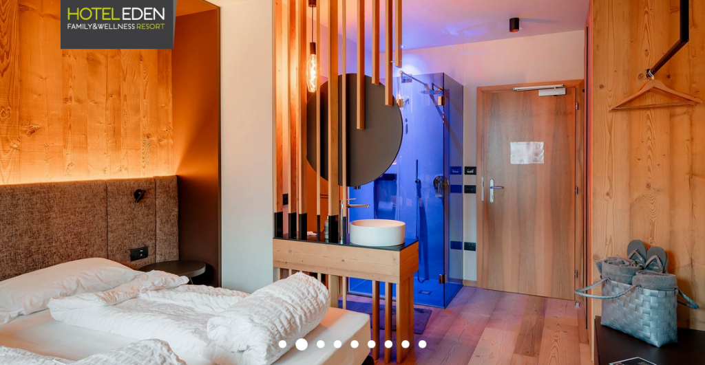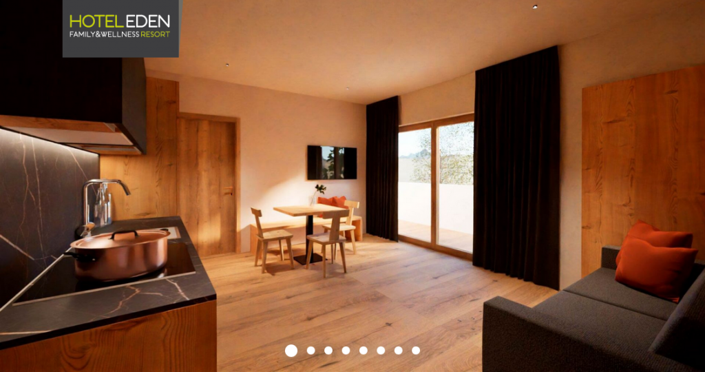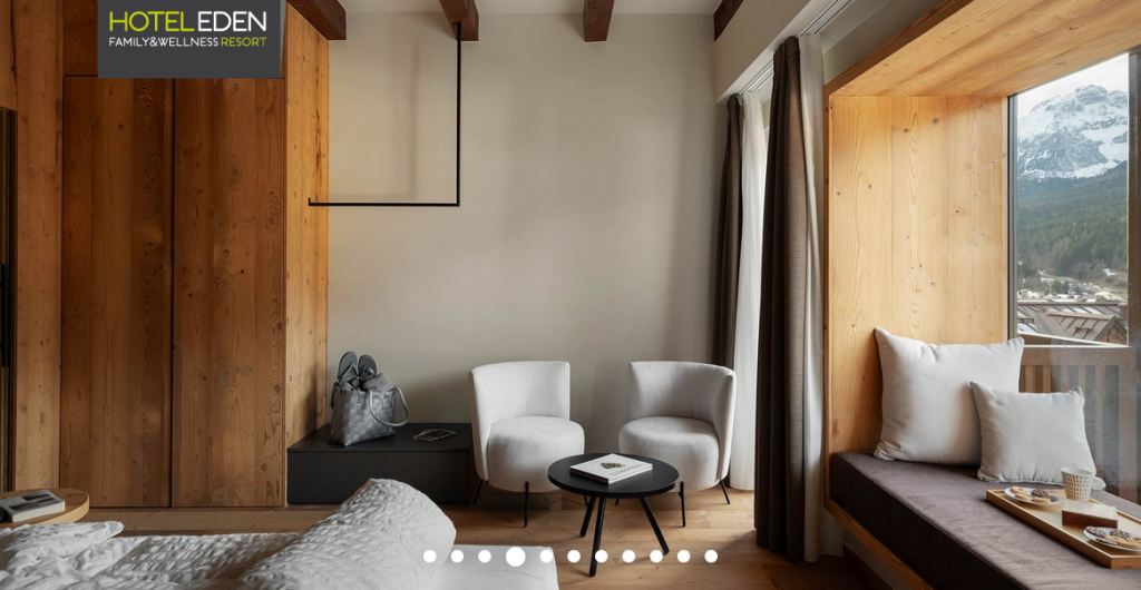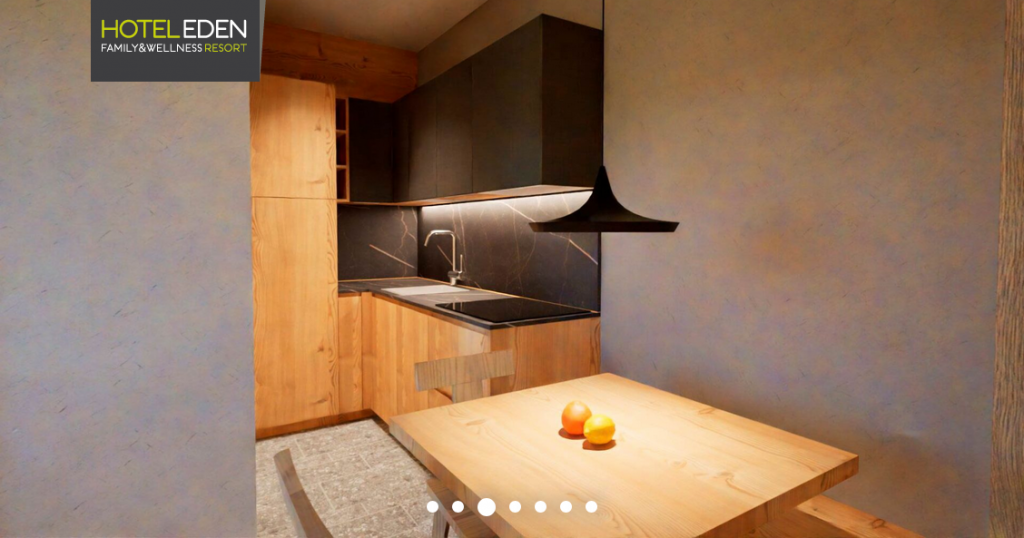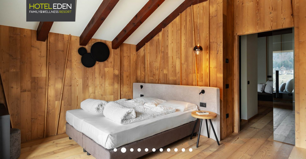 Najbardziej prestiżowy apartament przeznaczony dla 3-4 osób. Charakteryzuje się wspaniałymi oknami z panoramicznym widokiem na wioskę Andalo i Dolomity Brenta i jest urządzony w nowoczesnym stylu alpejskim. Pokoje można podzielić przesuwanymi drzwiami. Wyposażenie obejmuje telefon, minibar, 2 telewizory i sejf. Dla Gości przygotowano również szlafroki i kapcie do spa Eden.